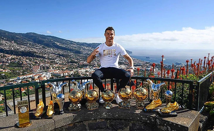 Сегодня Роналду выложил в инстаграм фотографию со своими главными индивидуальными наградами. На фото – приз игрока года по версии ФИФА (крайний слева), пять «Золотых мячей», две награды ФИФА «The Best», четыре «Золотых бутсы» и три приза УЕФА лучшему игроку года в Европе (с рогами). Кадр сделан на родине Криша – на Мадейре.