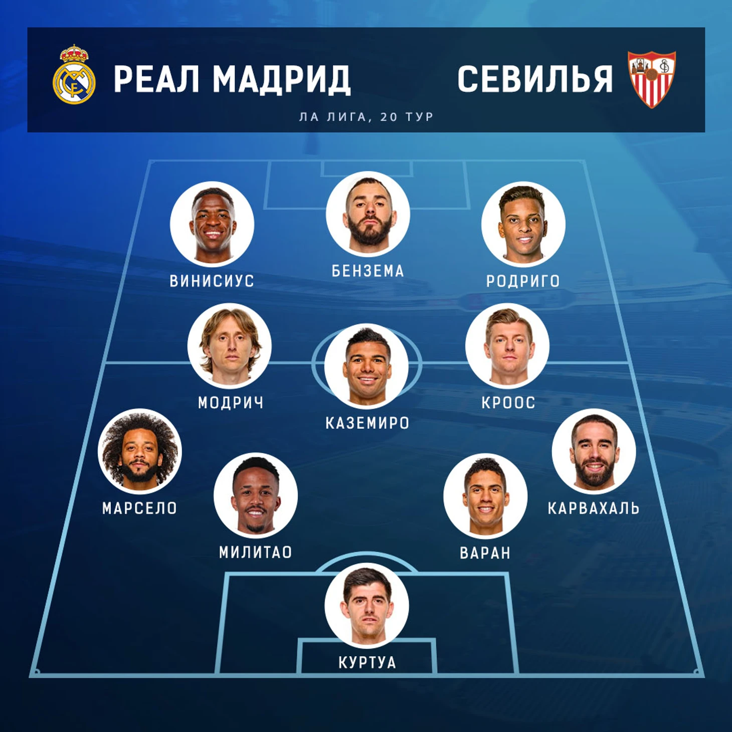 В этот раз в заявку не попал ни Серхио Рамос, ни Эден Азар, которые все еще восстанавливаются от травм, не повезло Хамесу и Мариано, а также Феде Вальверде, который отбывает дисквалификацию. Зато может сыграть Браим Диас, Эдер Милитао или Начо. Давайте же вместе выберем состав на эту игру.