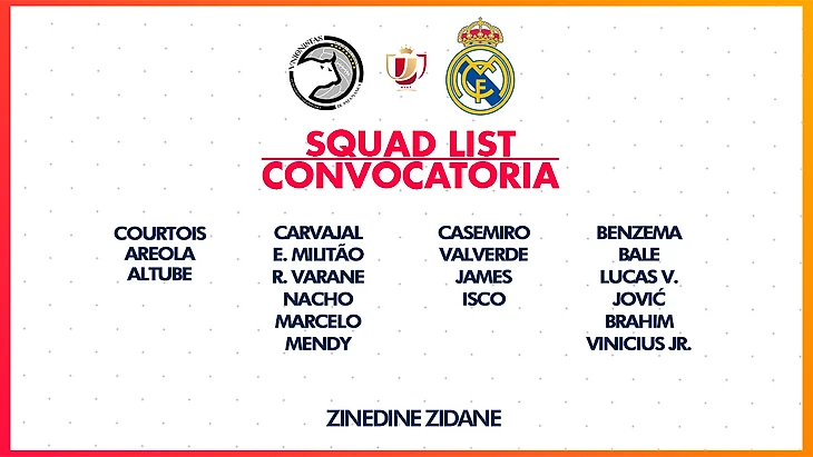 Из заявки исключены Тони Кроос и Лука Модрич, однако нашлось место для Хамеса и Иско. Также нет Серхио Рамос, который восстанавливается от травмы голеностопа. В атаке нет двух игроков, которых можно было бы ожидать в заявке на матч с командой Сегунды Б — Родриго Гоэса и Мариано Диаса. Похоже, несмотря на то, что Зизу неоднократно говорил о том, что доволен всеми своими футболистами, Мариано в этот список не входит...