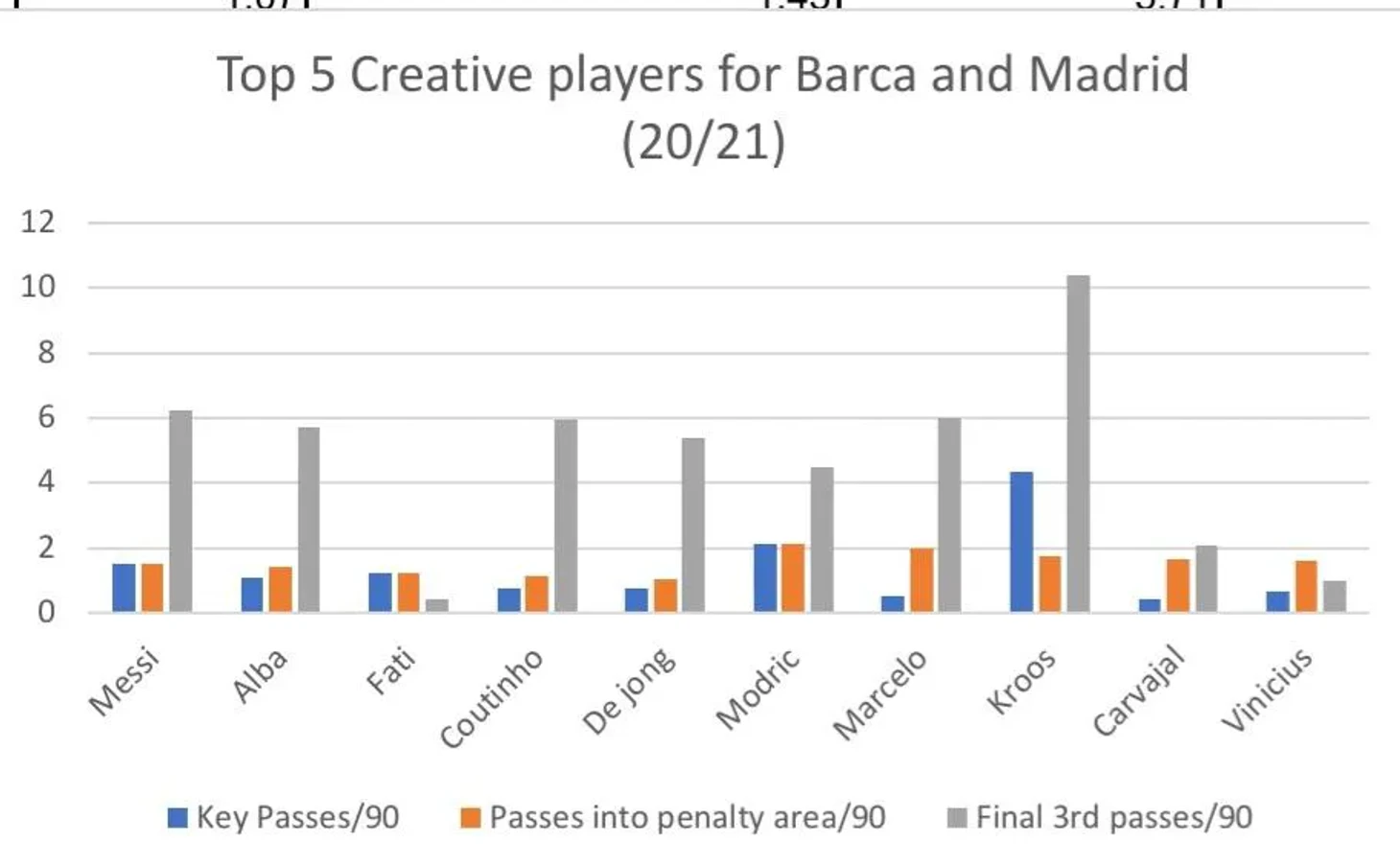 Результаты потрясающие! Похоже, Тони Кроос намного опережает игроков «Барсы» и «Реала» в двух из этих трех областей - заключительных трех передачах (>10) и ключевых передачах (>4).