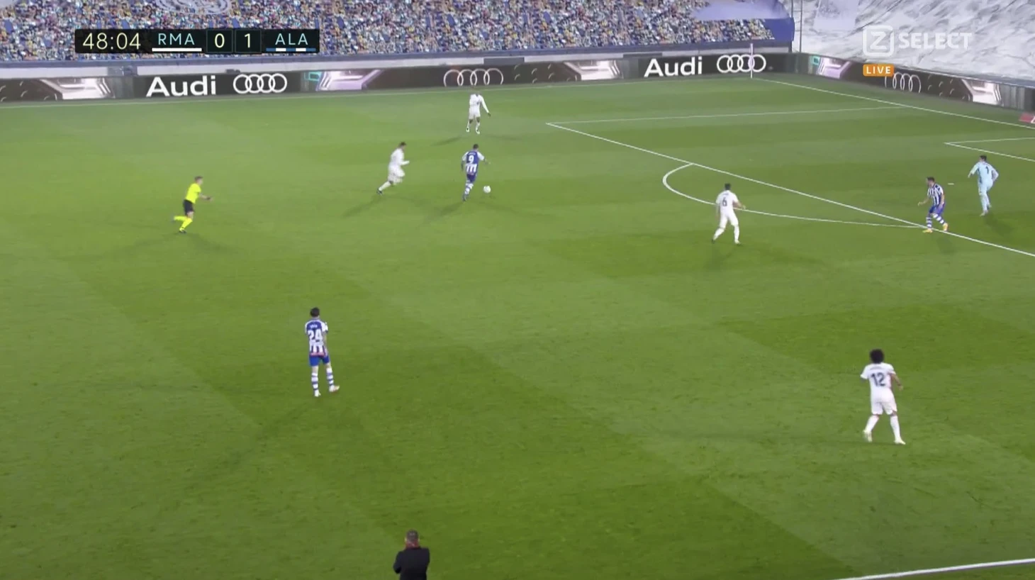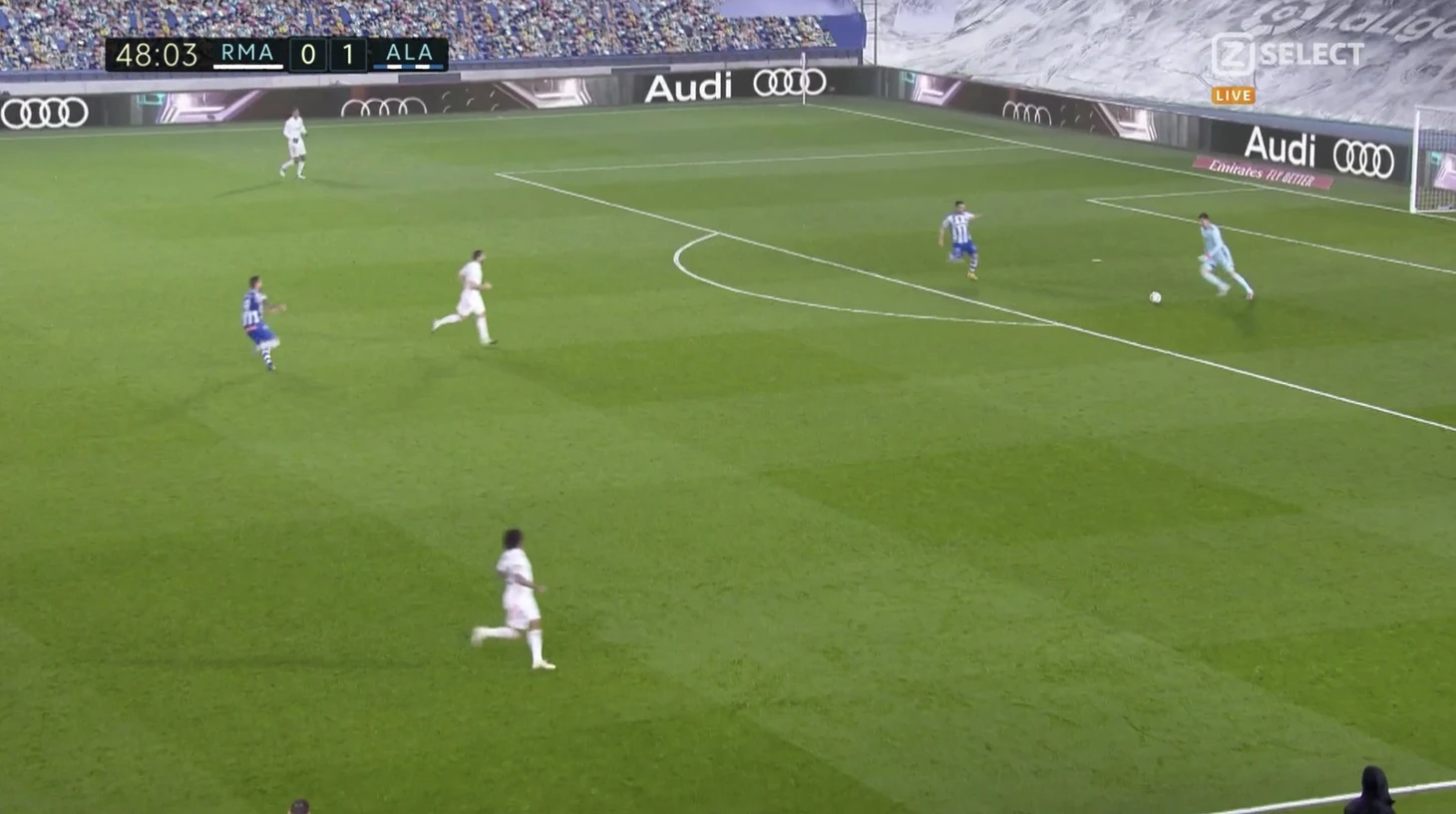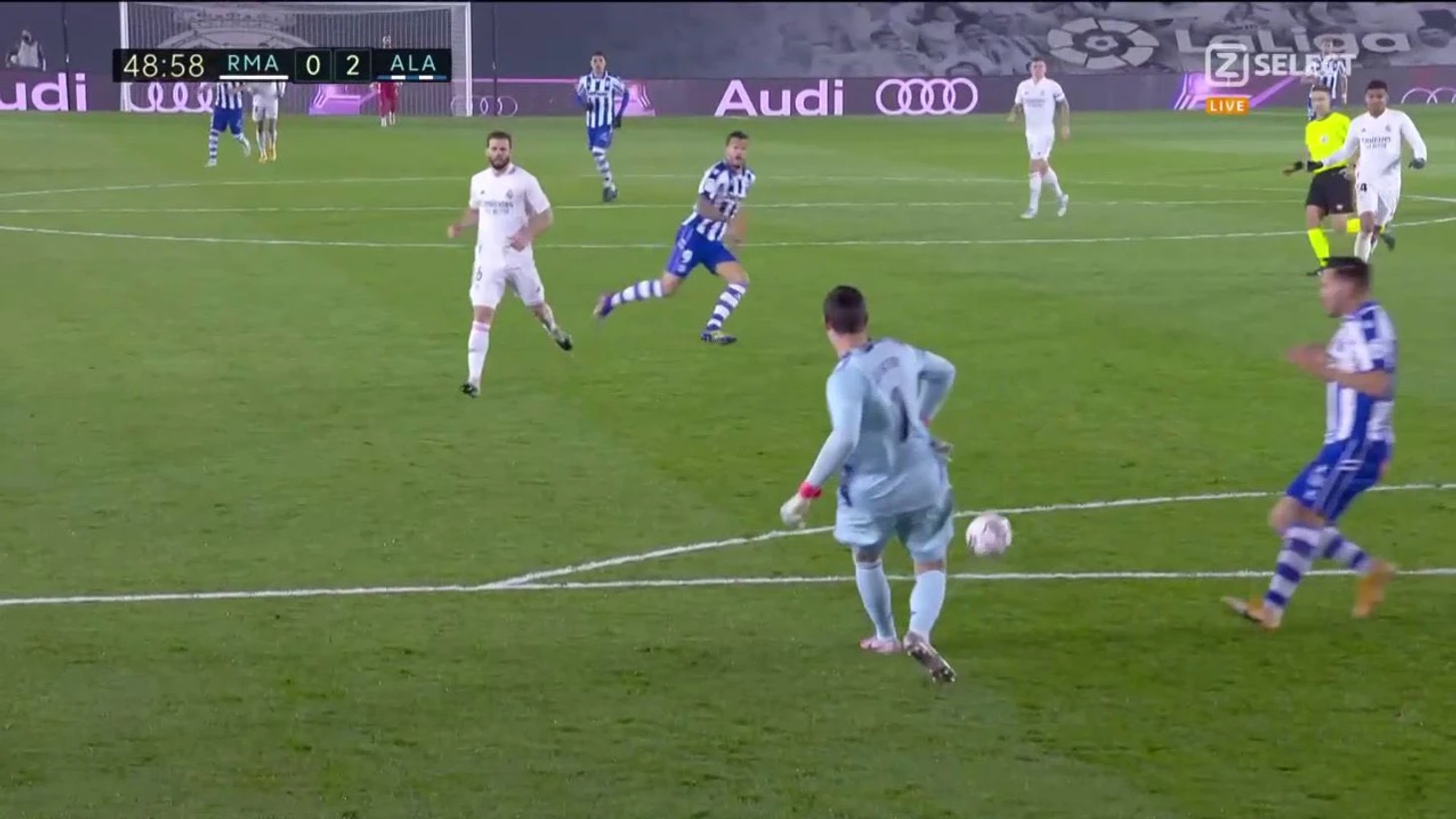 На 49 минуте вратарь получил мяч в ноги. «Алавес» прессинговал, и вместо того, чтобы сделать вынос, Тибо решил отдать сложную передачу левой ногой в центр.