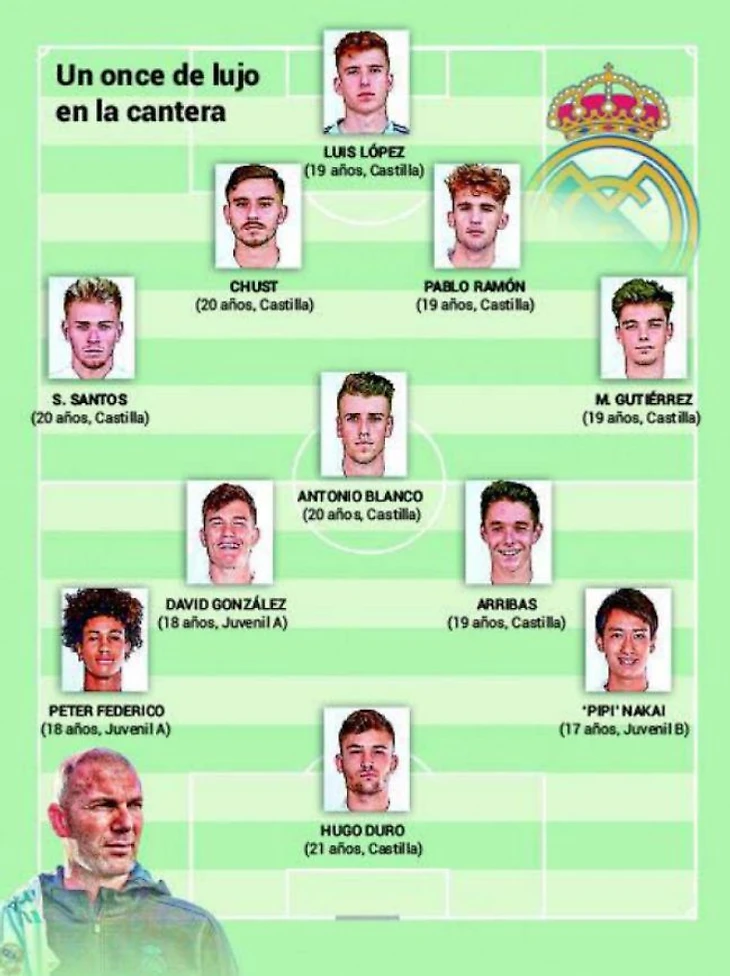 В этом сезоне под руководством Зидана дебютировали три игрока кантеры (Серхио Аррибас, Марвин и Виктор Чуст), и еще шестеро остались в шаге от дебюта, попав в заявку – это Уго Дуро, Антонио Бланко, Серхио Сантос, Оскар Аранда и вратари Лукас Канисарес и Луис Лопес. Кроме того, французский специалист приглашал для участия в тренировках таких блестящих юношей, как Такухиро Накаи, он же Пипи, и Давида Мельядо. Поскольку такие игроки, как Иско и Мариано Диас подвержены остракизму, Зидан обязан привлекать игроков кантеры…