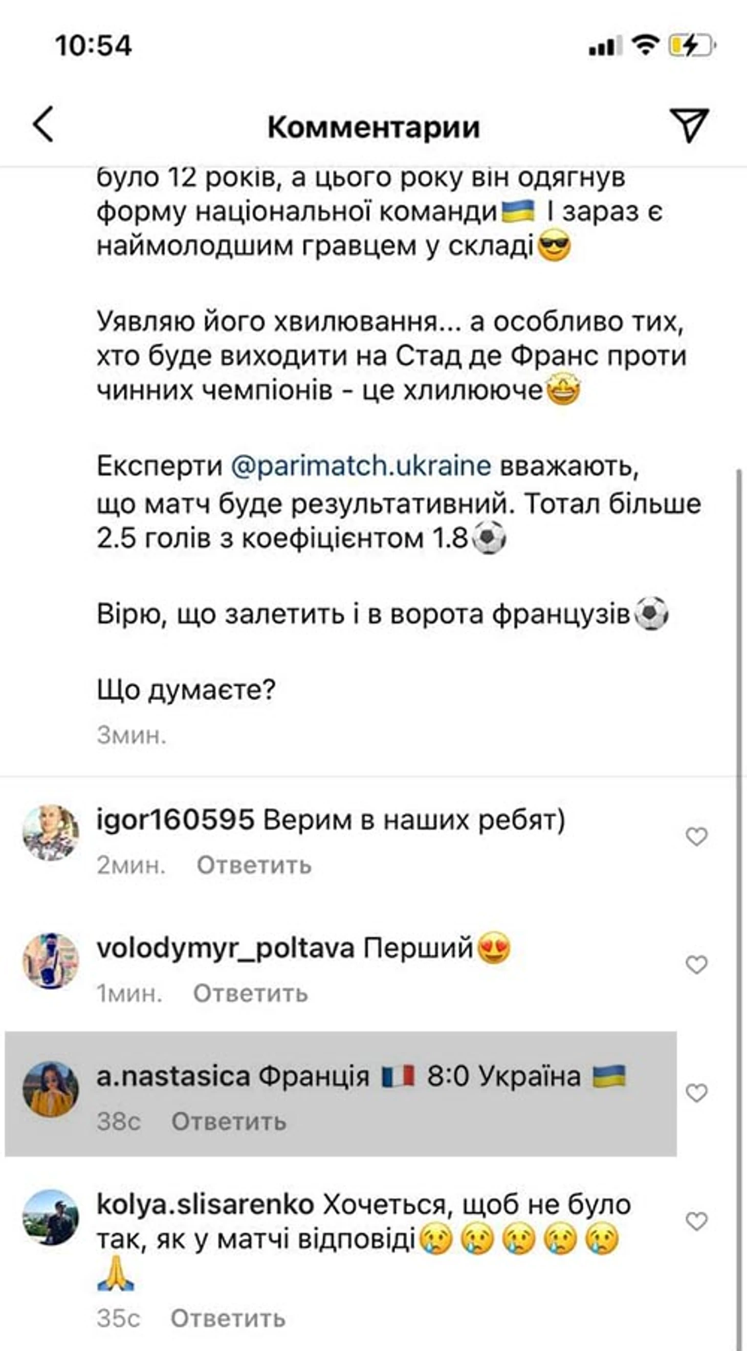 Жена Лунина, Анастасия, оставила комментарий под постом украинской телеведущей Александры Лободы, где написала свой прогноз на матч Украина – Франция: