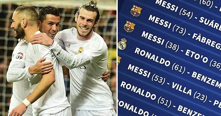 9. Роналду (51) - Бензема (28) - Бэйл (19): 98 голов в сезоне 2015/16.