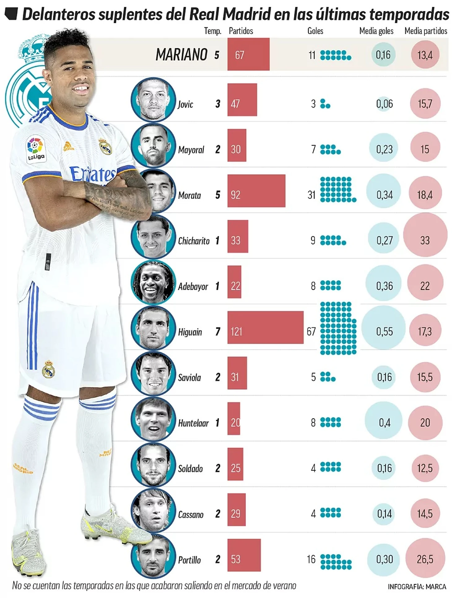 История Мариано Диаса в мадридском «Реале» уникальна. Игрок проводит пятый сезон в первой команде с тех пор, как летом 2018 года клуб решил заплатить «Лиону» 33 миллиона, плюс бонусы. Он забил 11 голов (в среднем 2,2 за кампанию) и сыграл 67 матчей (в среднем 13,5, при этом максимум 22 в условиях пандемии). Что касается травм и повреждений, то их уже два десятка (шесть в этом сезоне).