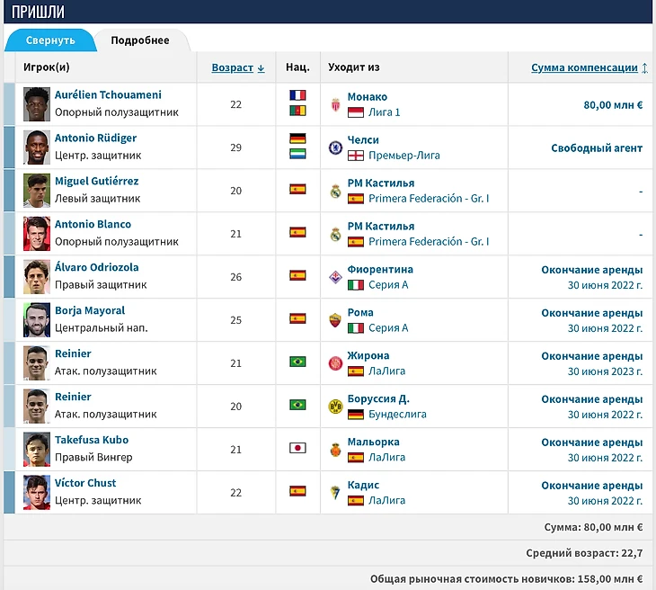 Как видите, «Реал» отдал деньги лишь за одного футболиста. 80 млн евро – большая сумма, но мадридцы платят за талант и молодость. Также клубу повезло урвать Антонио Рюдигера за бесплатно, его рыночная стоимость – 40 млн евро.