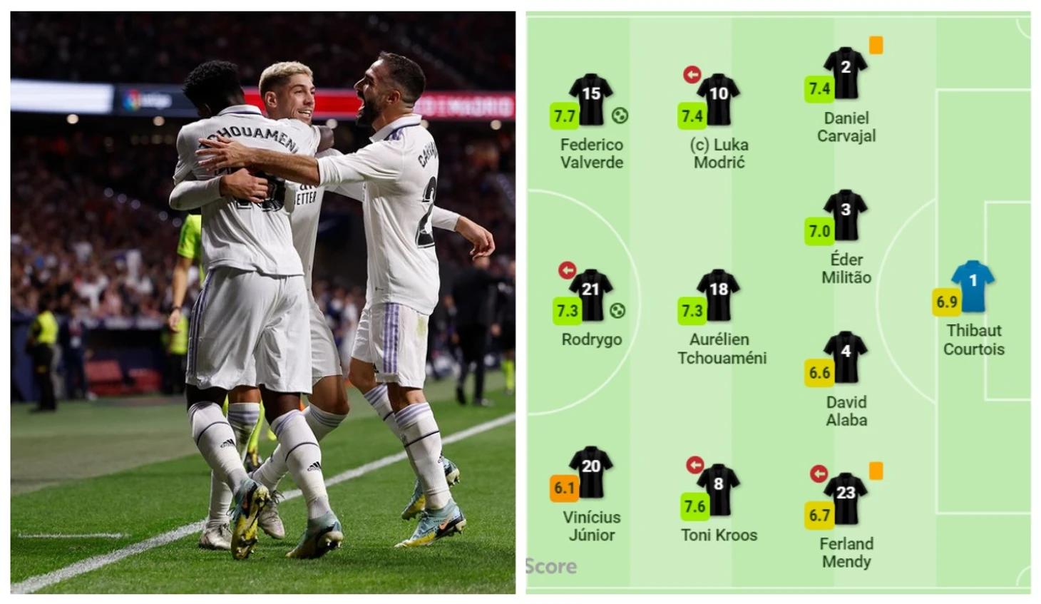 «Мадрид» практически решил исход мадридского дерби уже в первом тайме − сперва гол в ворота Яна Облака забил после красивого заброса Орельена Тчуамени Родриго, а второй мяч на счету у Федерико Вальверде, который лучше остальных отреагировал на отскочивший от штанги мяч и переправил его в ворота.