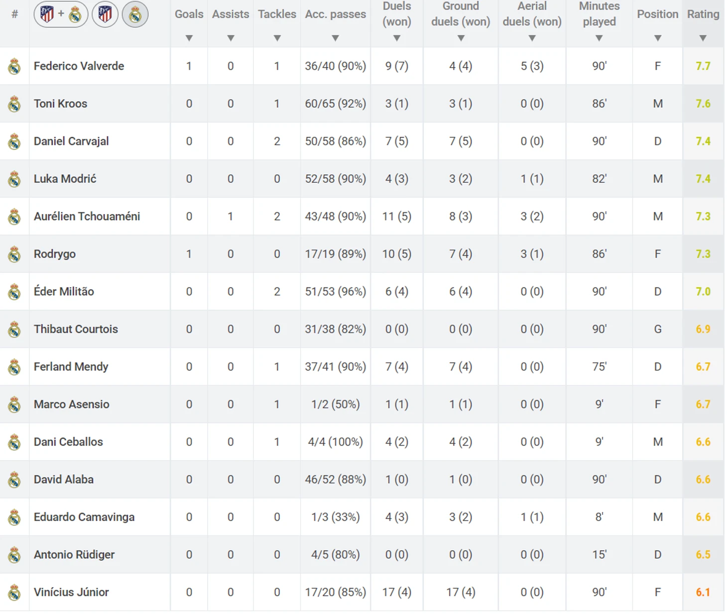 Также стоит отметить большой вклад Дани Карвахаля, который показал шикарный перфоманс на правом фланге и помог сохранить три очка для команды, а также игру Орельена Тчуамени, который сотворил первый гол и сделал 6 выносов мяча.