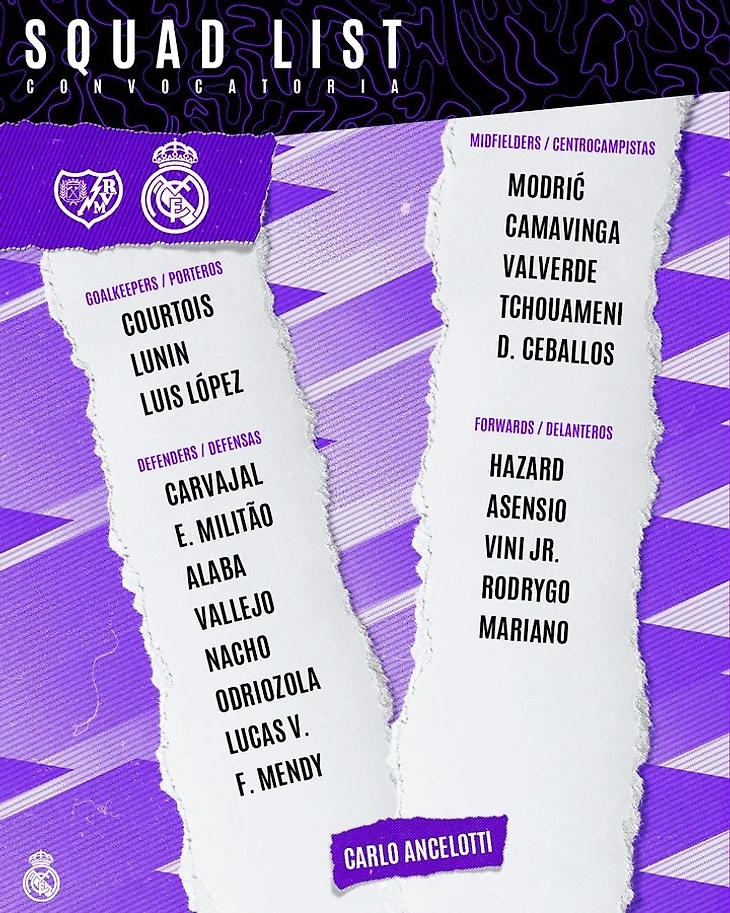 Вот как выглядит заявка Карло Анчелоттина матч «Мадрида» с «Райо»: