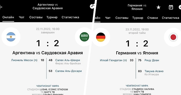 Сперва сильнейшая на бумаге команда (в нашем случае − Германия) открыла счет, причем сделала это также с пенальти − отличился Илкай Гюндоган (вчера − Месси). Германия, как и Аргентина, имела солидное преимущество в первом тайме, но во втором умудрилась дважды пропустить. Японцы, как и саудовцы, воспользовались временными помутнениями защиты своих соперников.