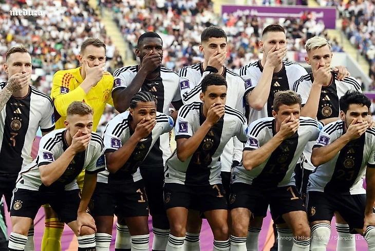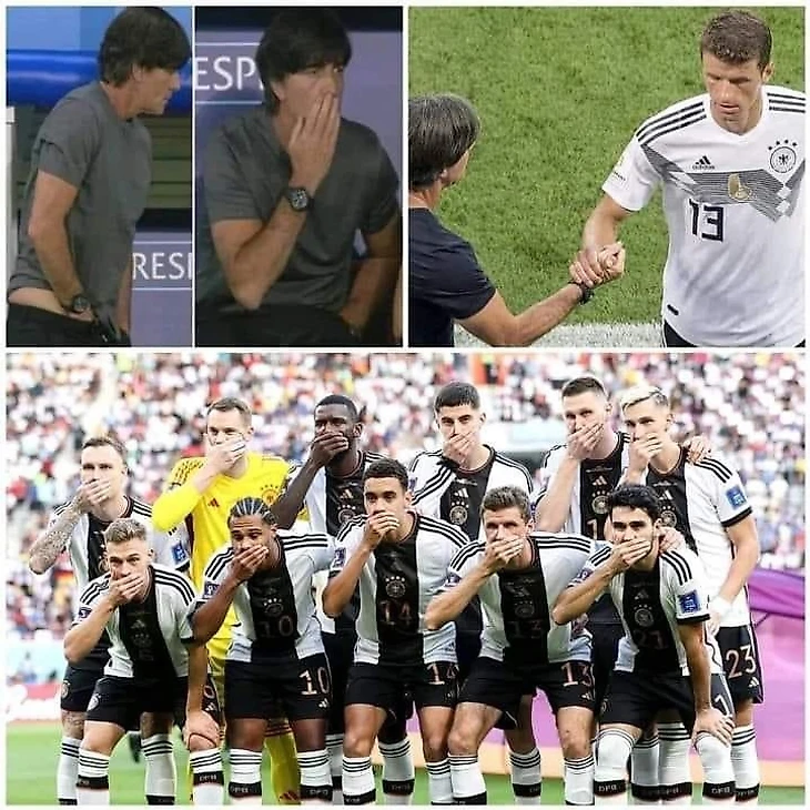 Немцам досталось и за то, что в начале матча они сделали групповое фото, закрыв рты руками в протест против дискриминации.