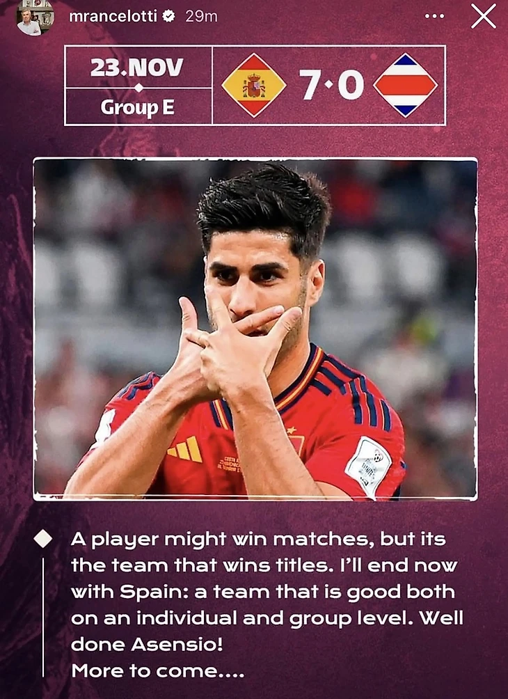 «Игрок может выиграть матч, но титулы выигрывает команда. Сейчас я разберусь с Испанией: команда хороша, как на индивидуальном, так и на групповом уровне. Молодец, Асенсио», - написал Анчелотти.