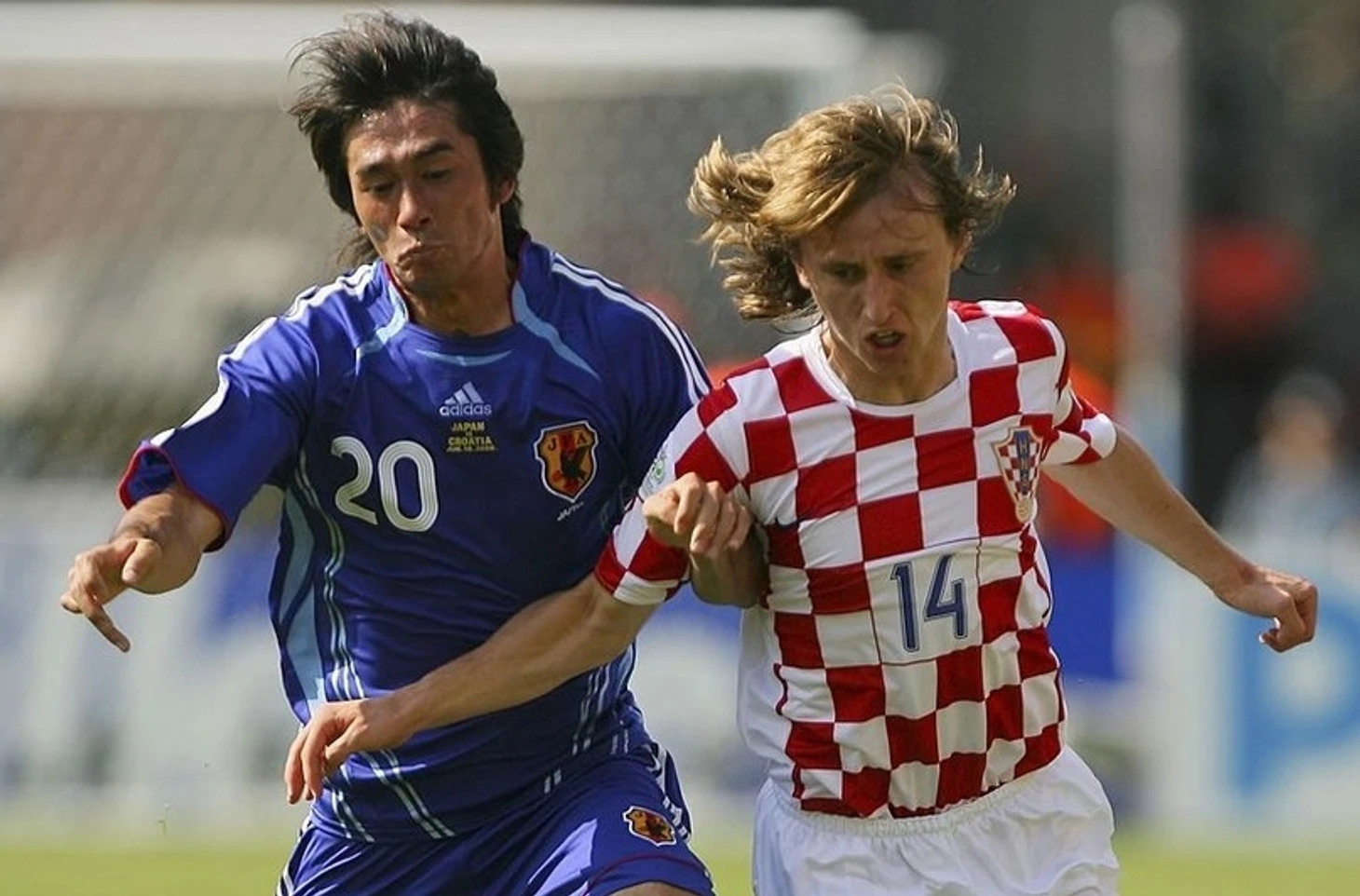 Молодой Лука Модрич пытается пробить крепкую японскую оборону.
