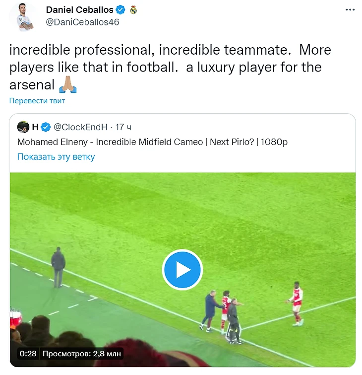 «Невероятный профессионал, невероятный товарищ по команде. Побольше бы таких игроков в футболе. Роскошный игрок для «Арсенала» 🙏🏽»