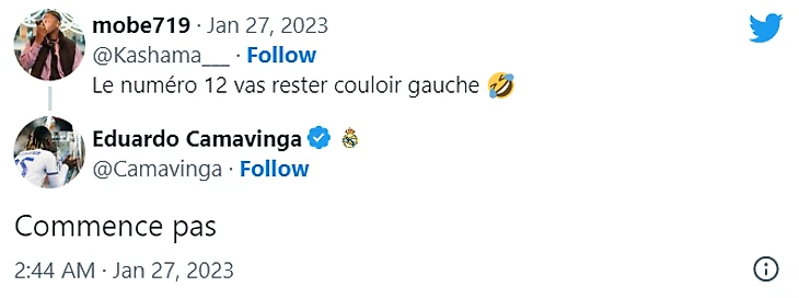 После мадридского дерби пользователь Kashama___ написал следующее: «Номер 12 продолжит играть на позиции левого защитника». Позже Камавинга ответил ему: «Не начинай».