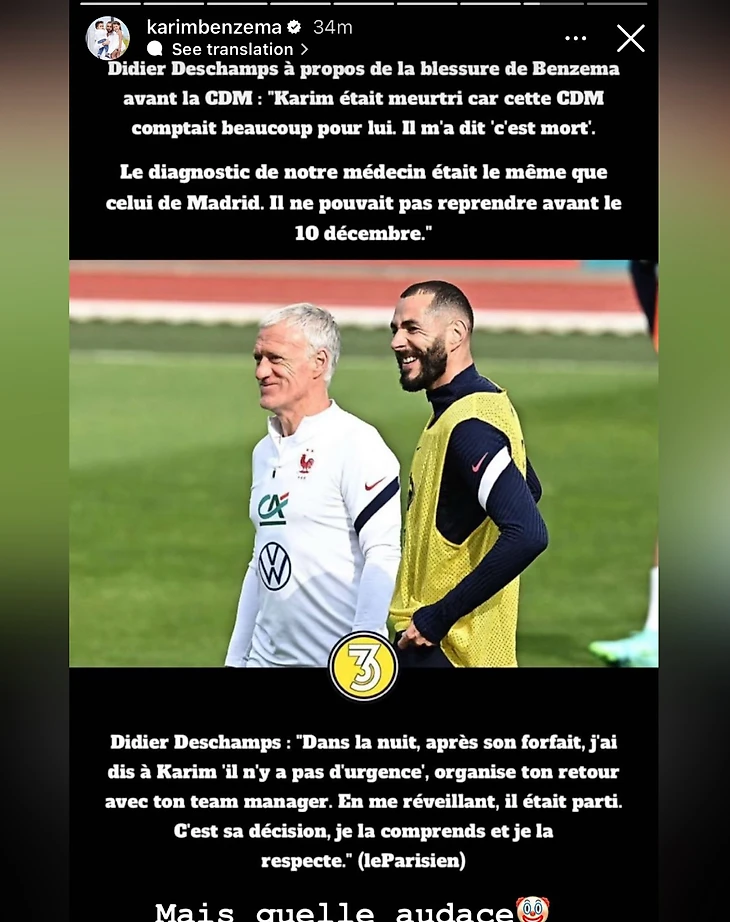 Также Дешам добавил: «Карим был в синяках, но этот ЧМ много значил для него. Диагноз нашего врача был таким же, как у «Мадрида». Он не мог возобновить тренировки до 10 декабря».