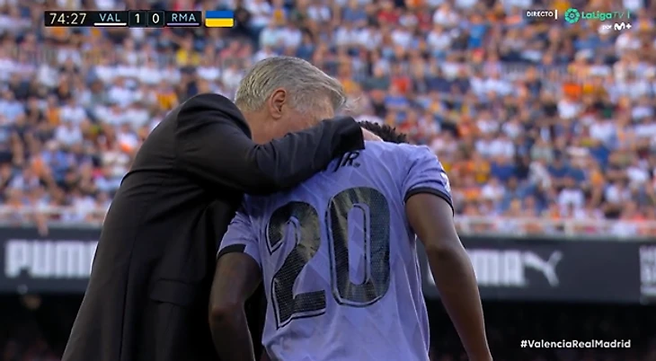Вини даже пригрозил покинуть игру, если расистские кричалки не прекратятся. Успокоить игрока смог только Карло Анчелотти, который по-отечески обнял его и что-то сказал. После этого игра продолжилась.