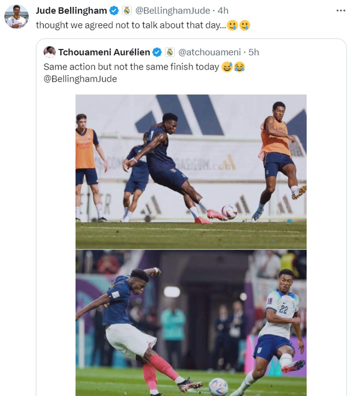Прошло полгода. Теперь Тчуамени и Беллингем вместе защищают цвета «Мадрида». На одной из тренировок «королевского клуба» парни умудрились в точности повторить тот самый гол из четвертьфинала чемпионата мира.