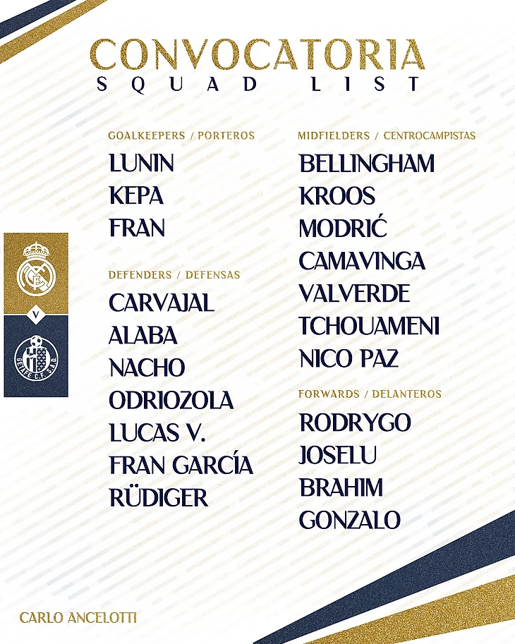В заявке команды из 21 игрока, которую сегодня подтвердил Карло Анчелотти, отсутствуют шесть игроков. Это Эдер Милитао и Тибо Куртуа, которые вернутся в следующем году, а также Арда Гюлер, Ферлан Менди, Винисиус Жуниор и Дани Себальос.