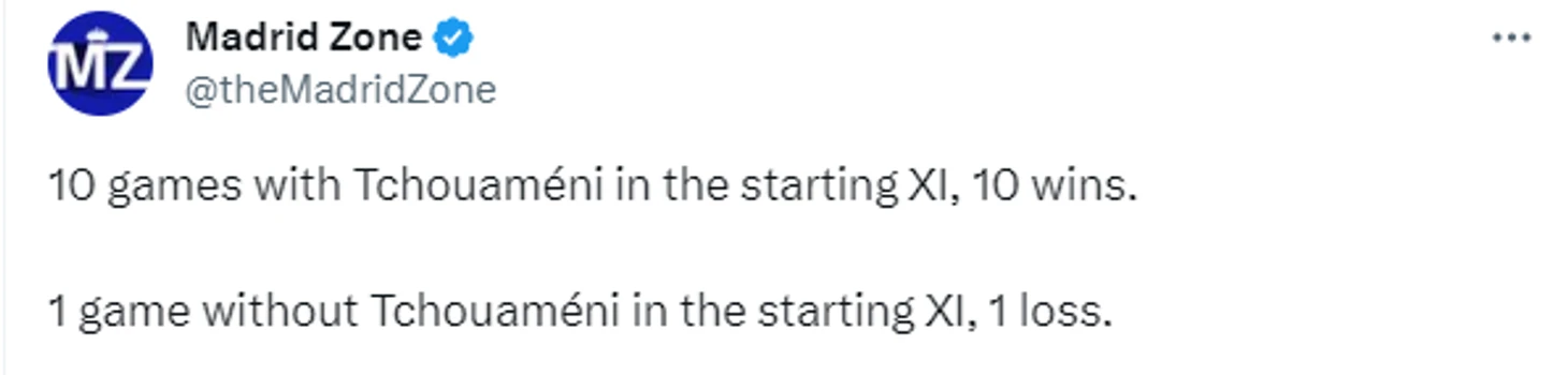 Фанатский аккаунт Madrid Zone подсчитал, что в этом сезоне Орельен Тчуамени был в основе десять раз и в каждом из этих матчей «Мадрид» побеждал. Единожды француз не попал в старт и тогда клуб проиграл.