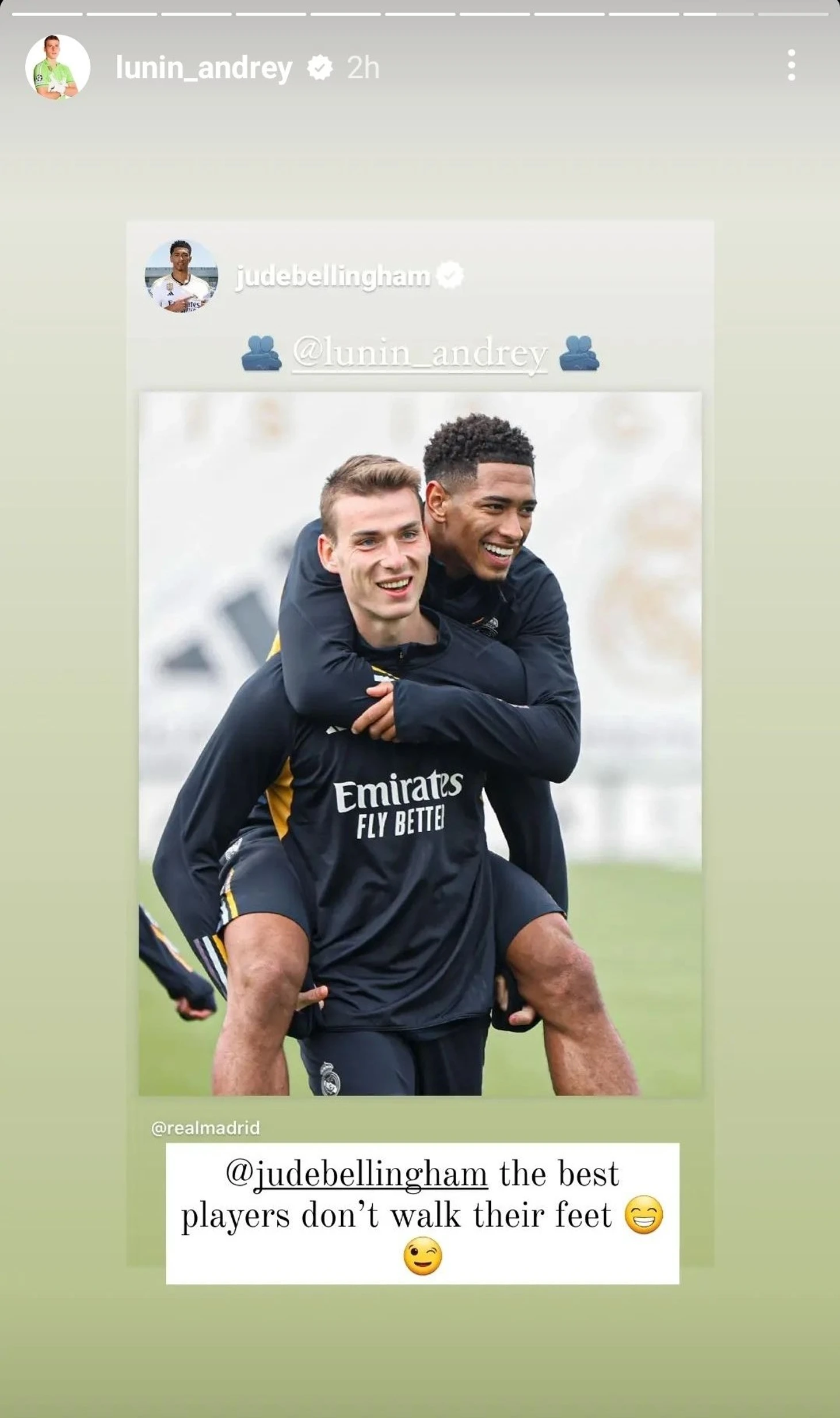 За пределами поля у англичанина также установилось взаимопонимание с новыми одноклубниками. Беллингем опубликовал в соцсетях фото, на котором запечатлено, как Лунин несет Джуда на спине.