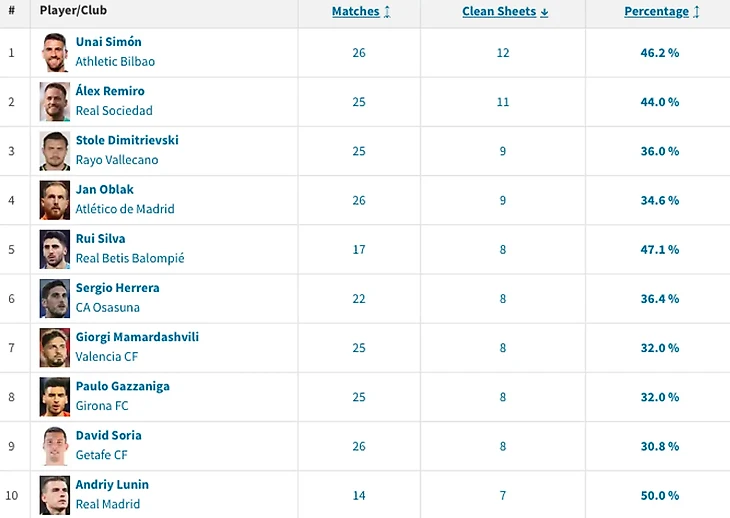 С показателем в 50% он лучший по матчам на ноль в Ла Лиге. Однако количество таких матчей больше вратаря «Атлетика» Унаи Симона − 12 или 42,6%.