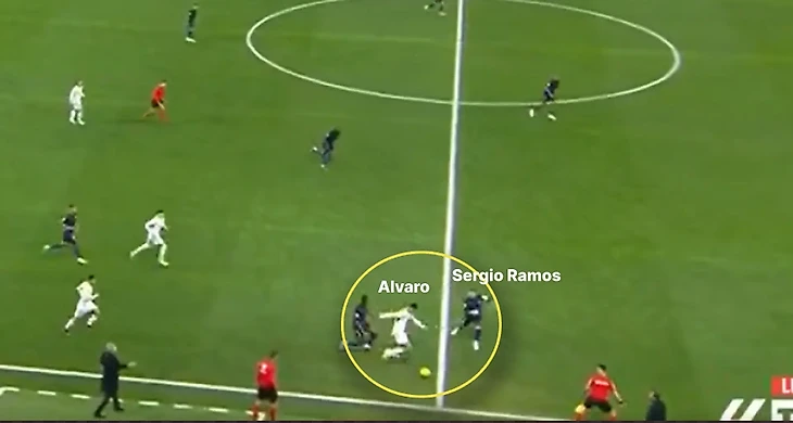 Альваро получил мяч недалеко от боковой линии и с легкостью оставил Рамоса позади.