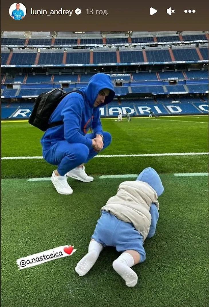 Голкипер «Мадрида» Андрей Лунин поделился очаровательном видео со своим сыном. В мае малышу исполнится только 2 года, но он уже проявляет явный интерес к футболу. Отец его в этом поддерживает.