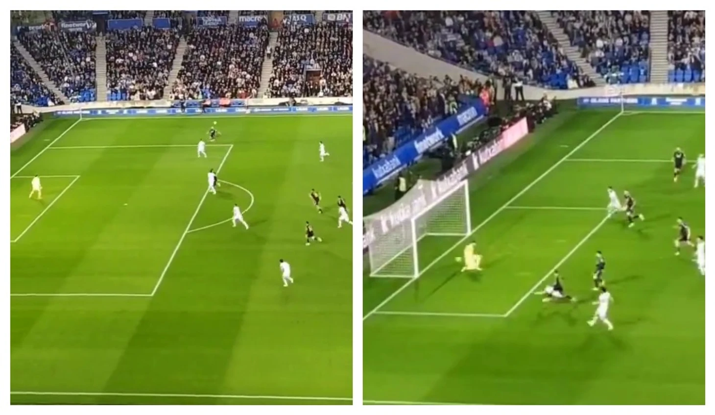 Сегодня ночью полузащитник «Реала» впервые вышел в стартовом составе на игру чемпионата Испании и на 29-й минуте замкнул прострел защитника Даниэля Карвахаля. Вот как этот гол выглядел с трибун.