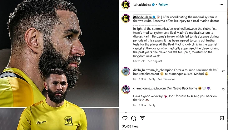 «Аль-Иттихад» и «Реал Мадрид» пришли к соглашению о том, что футболист пройдет осмотр в клинике «Мадрида» под руководством команды, которая работала с ним во время его выступлений за клуб. Футболист отправился в Мадрид и вернется в Саудовскую Аравию на следующей неделе».
