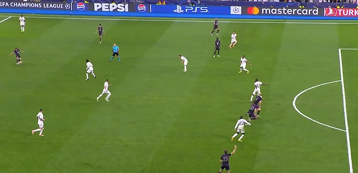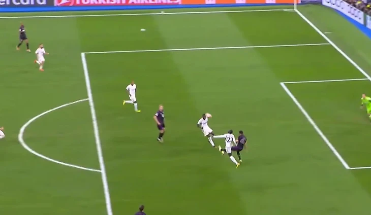 Проигрывая со счетом 2:1 в добавленное время ко второму тайму, «Бавария» бросила в атаку всех своих игроков. Киммих сделал прострел в штрафную, где Мазрауи пытался выиграть воздух. Из этого скриншота видно, что, вероятно, это было не самое простое решение для линейного судьи и он мог ошибиться.