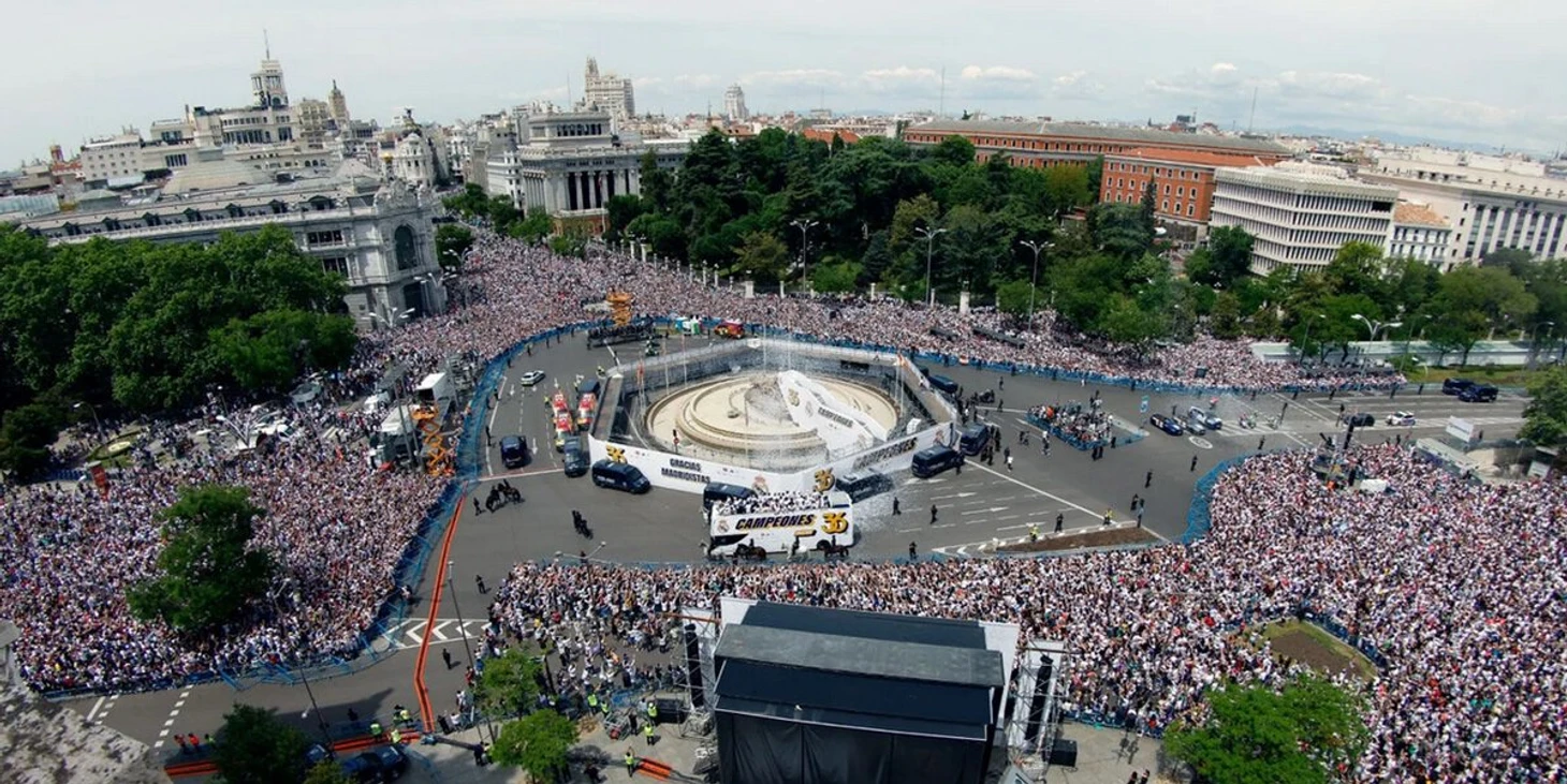 Затем, в рамках чемпионского парада, «Реал» на автобусе отправился на площадь к фонтану Сибелес, где традиционно празднует свои победы. Там также собрались болельщики.