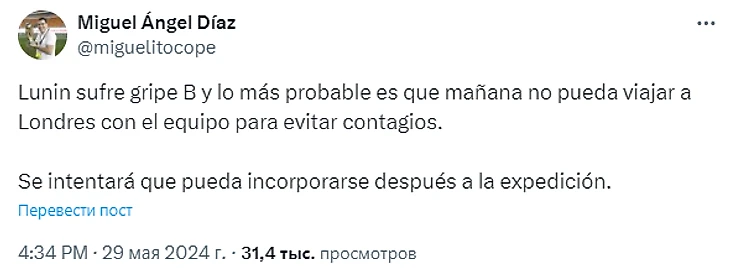 «Лунин болеет гриппом B и, скорее всего, завтра он не сможет поехать с командой в Лондон, чтобы никого не заразить. Позже будет предпринята попытка дать ему возможность присоединиться ко всем».