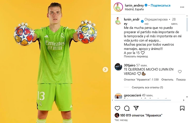 Украинский вратарь «Мадрида» Андрей Лунин извинился перед болельщикам клуба за то, что за несколько дней до финала Лиги чемпионов заболел гриппом и не сможет помочь команде.