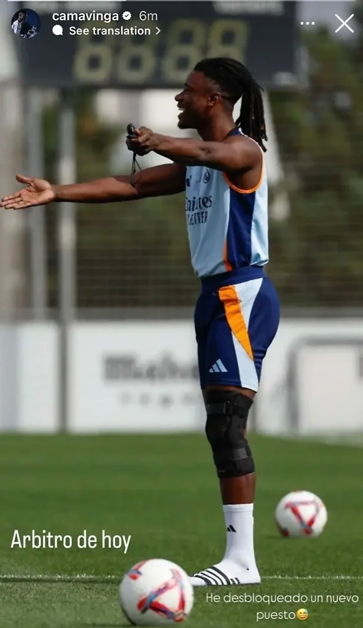 «Я открыл для себя новую позицию: судья», – написал Эдуардо Камавинга в соцсетях, прикрепив фотографию с последней тренировки «Реала».