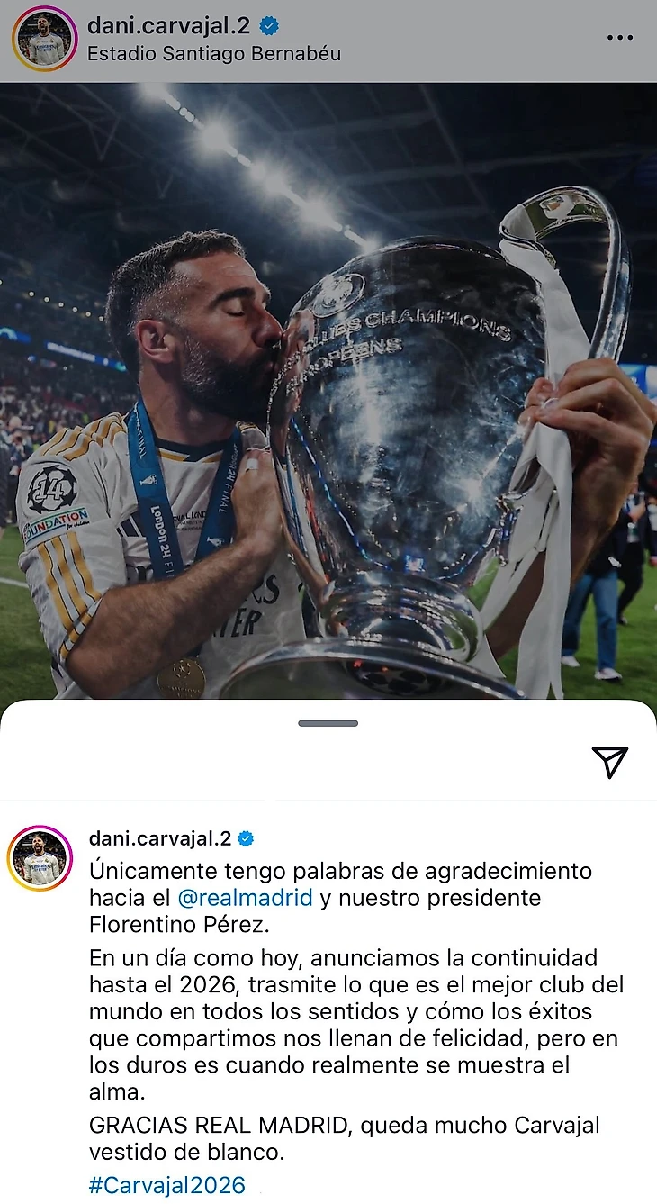 Успехи, который мы разделяем, наполняют нас счастьем, а в трудные моменты по-настоящему раскрывается душа. Спасибо «Реалу», Карвахаль надолго останется в белом».