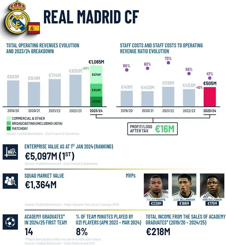 «Мадрид» вошел в футбольную финансовую историю. Он стал первым клубом, чей операционный доход в сезоне-2023/24, по данным отчета Football Benchmark European Champions Report 2025, превысил один миллиард евро.