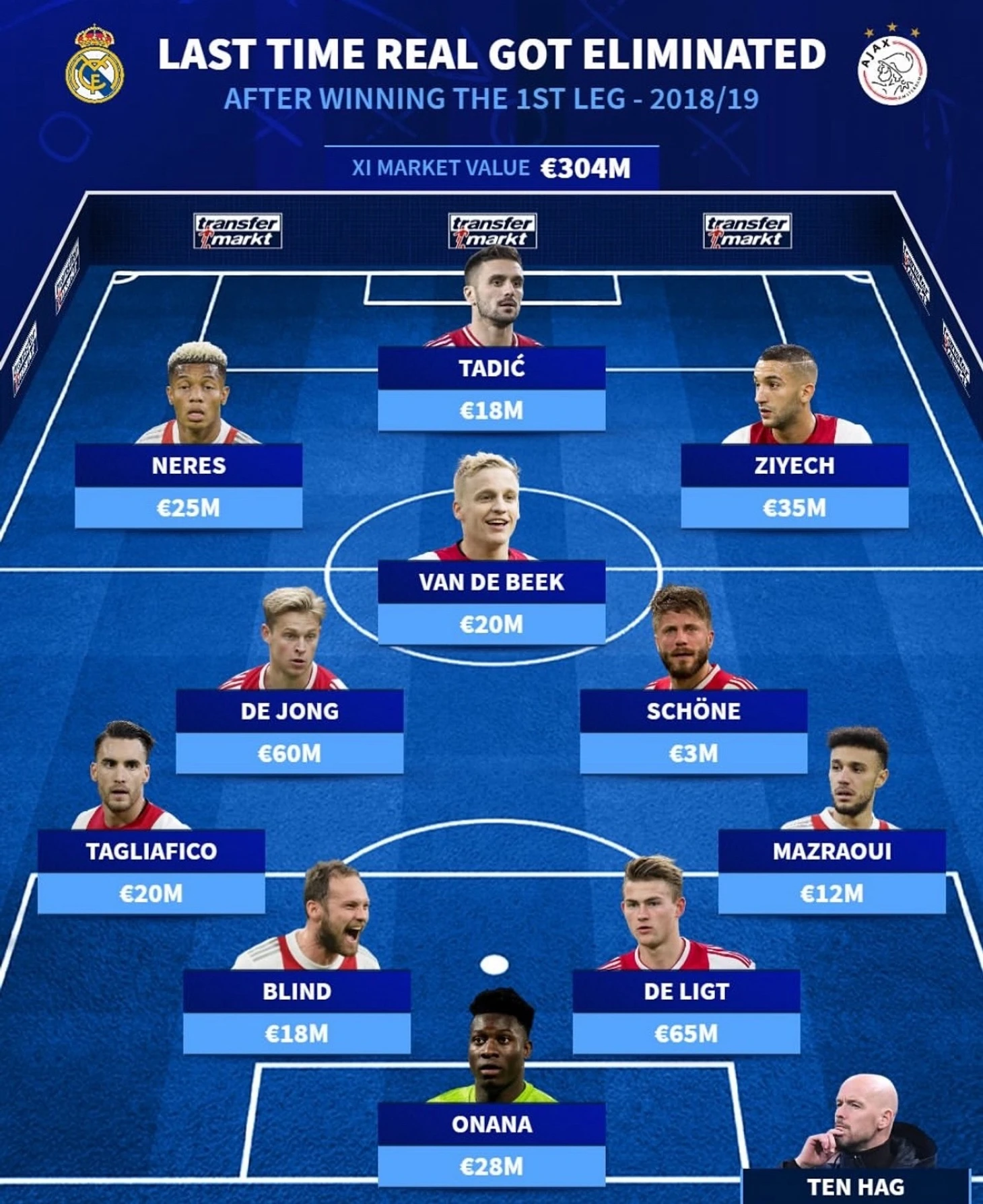 Тот «Аякс» под руководством Эрика тен Хага был богат талантливой молодежью, капитанскую повязку носил 19-летний Маттейс де Лигт. Суммарно за состав пришлось бы заплатить 304 млн евро. В сезоне-2018/19 «Аякс» добрался до полуфинала ЛЧ, где уступил «Тоттенхэму».