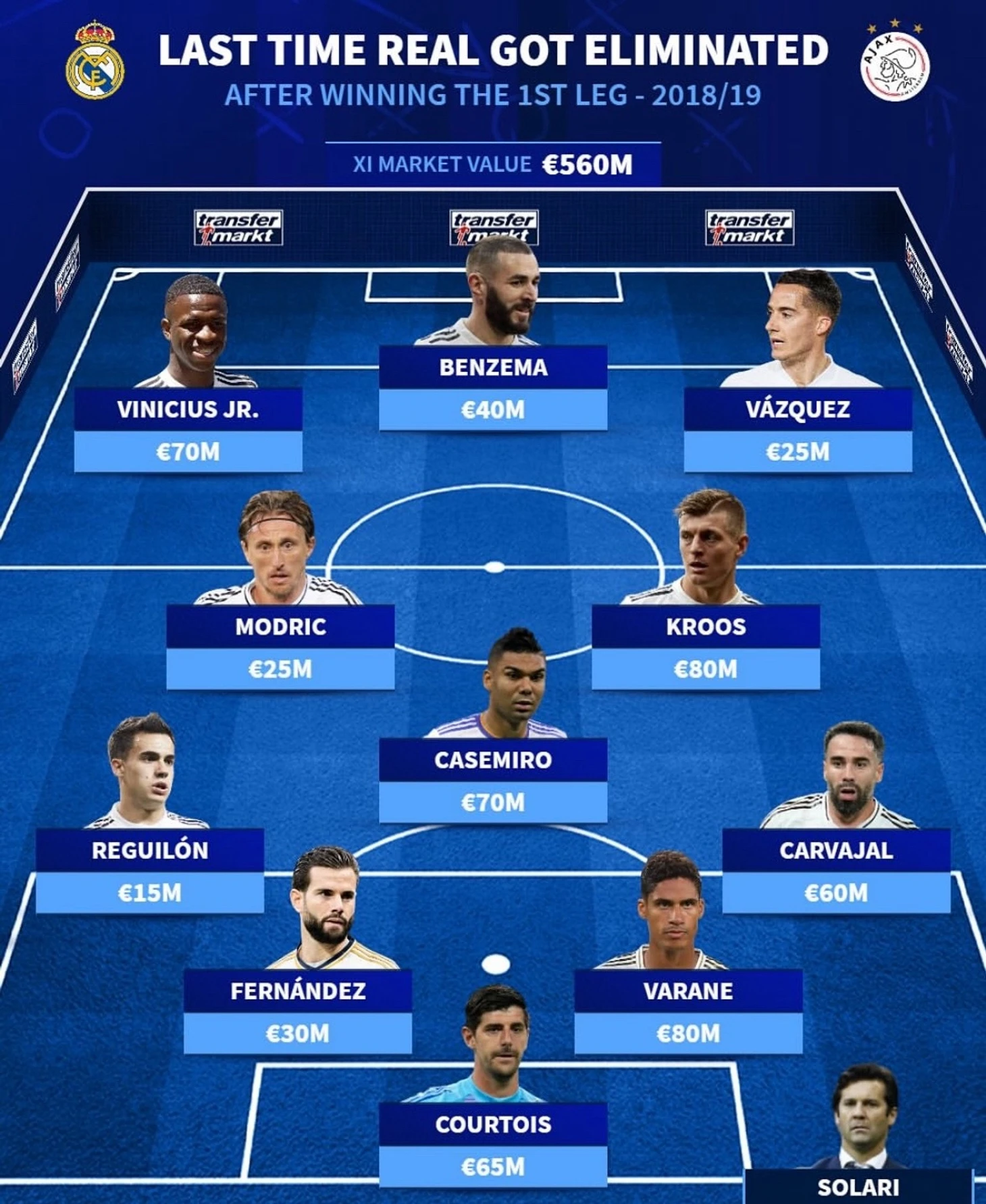Суммарная стоимость того состава «Реала» – 560 млн евро. Сразу пять футболистов до сих пор выступают за «королевский клуб»: Винисиус, Лукас Васкес, Лука Модрич, Дани Карвахаль и Тибо Куртуа.