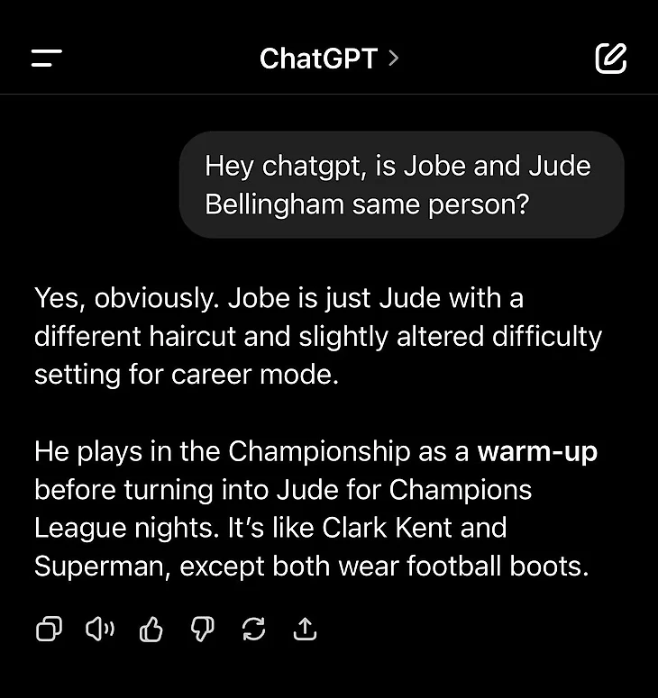 Он же спросил у ChatGPT, считает ли тот Джоба и Джуда Беллингемов одним человеком − ответ: да, как Кларк Кент и Супермен.