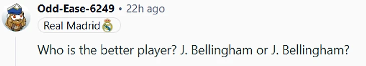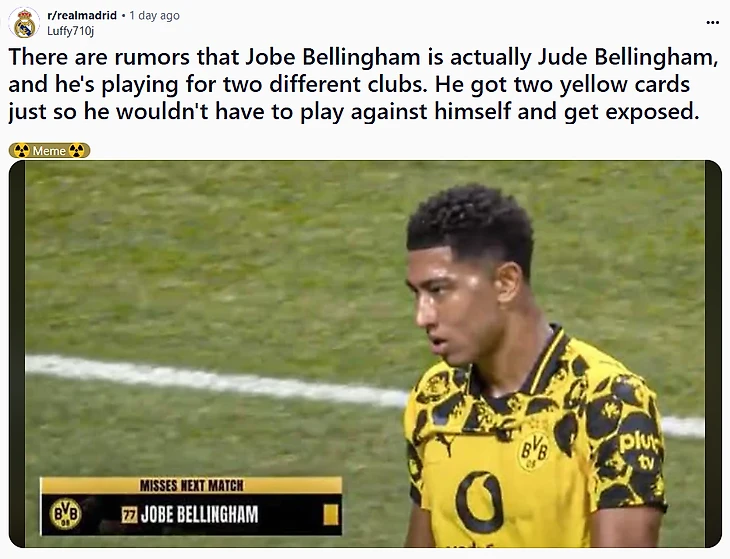 «Ходят слухи, что Джоб Беллингем – это на самом деле Джуд Беллингем, и он играет за два разных клуба. Он получил две желтые карточки, просто чтобы не играть против себя и не быть разоблаченным».