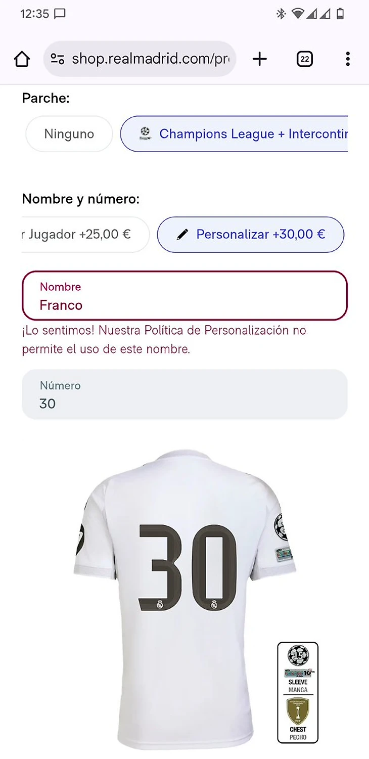 Почему? Дело не в игроке, а в истории. Как пишет ABC, «Реал» блокирует печать имени «Franco» из-за ассоциаций с диктатором Франко. Попробуешь вбить в официальном магазине — получаешь сообщение: «Использование этого имени недопустимо».
