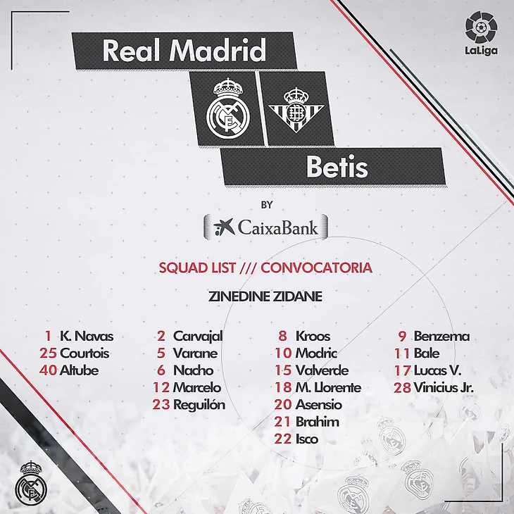 В заявку мадридского «Реала» на матч последнего, 38-го, тура Ла Лиги против «Бетиса» по решению тренерского штаба вошли 19 человек.