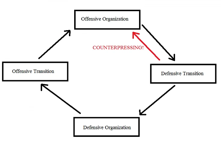 Основные фазы игры показаны на рисунке выше. Но что если бы мы могли сразу переходить от наступательной фазы к оборонительной, а затем снова к наступательной? – Если контрпрессинг правильно организован, то такой маневр удается довольно часто.