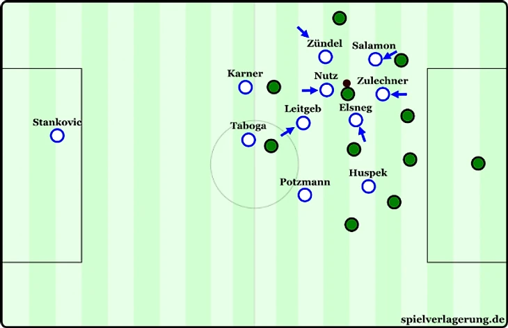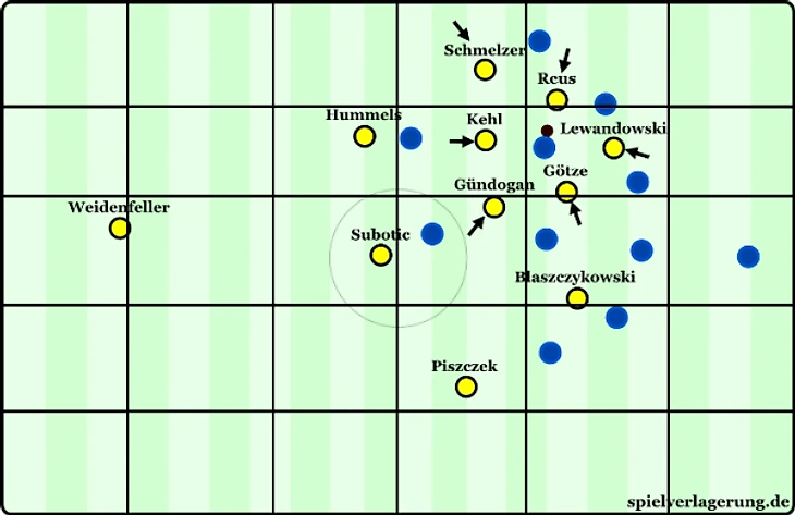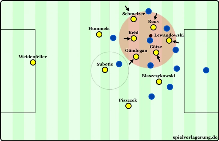 Футболисты Дортмунда смещаются в сторону небольшого участка поля, в то время как остальные остаются в некотором отдалении во время контрпрессинга.