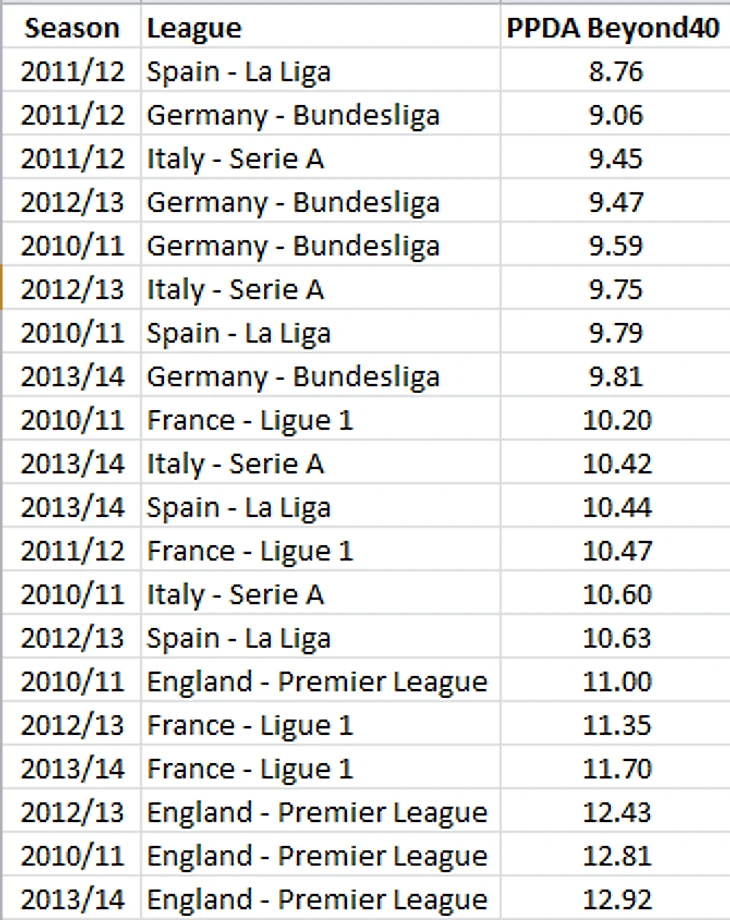 Мы также видим, что в трех лигах/сезонах, мы могли быть свидетелями самых высоких уровней интенсивности прессинга в течении сезона 2011/12.