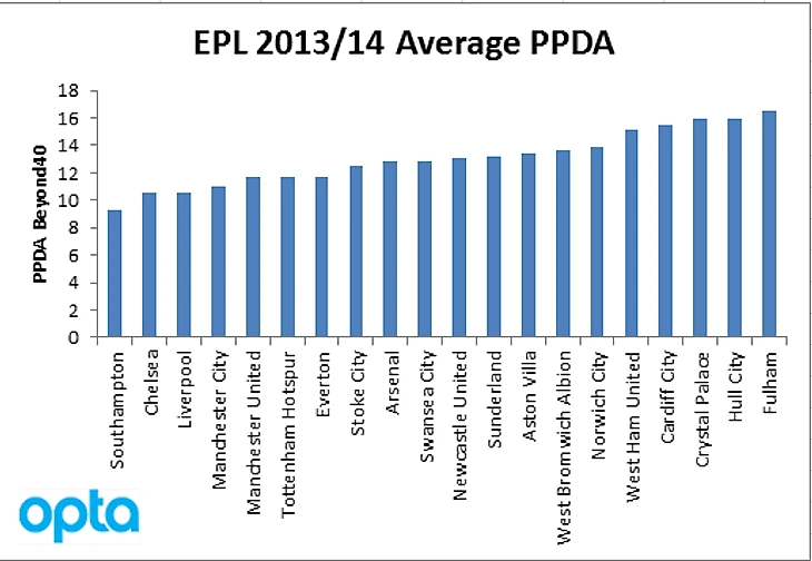 Маурисио Почеттино в этом плане является одним из эталонных тренеров, которые любит играть в высокий прессинг. Времена, когда он тренировал «Саутгемптон», являются хорошим примером того, как может PPDA выглядеть.