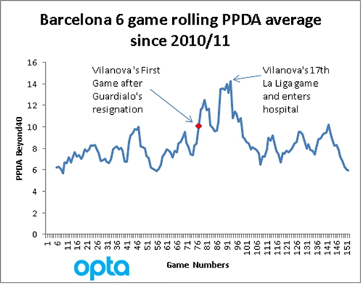 В течении двух сезонов, что Пеп был на «Камп Ноу», «Барса» еле заметно колебалась в диапазоне 6-9. Однако, как только Виланова взял бразды правления, значение PPDA начали расти. Иными словами, «Барселона» предпринимала меньше оборонительных действий за линией x=40 чем ранее.