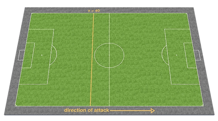 Здесь, мы смотрим с точки зрения команды, которая защищает ворота, расположенные слева на картинке. Мы используем оборонительные действия (отборы, перехваты, единоборства и нарушения), которые возникают справа от линии, которая обозначается x=40 (40 метров от ворот). Так что метрика будет включать в себя все оборонительные действия на чужой половине поля, плюс небольшая часть своей половины. Это нужно для того, чтобы понять интенсивность именно высокого прессинга со стороны обороняющейся команды.