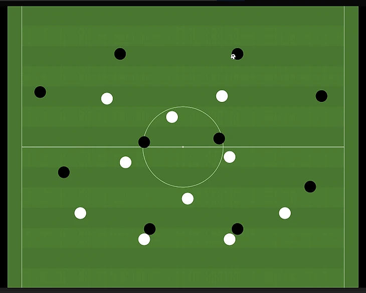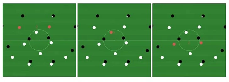 Точки видите? – Это те самые 2-1-2. Важно, что эти парни играют как пятёрка юнитов в игрушках - они всегда двигаются вместе. Другие пять юнитов занимаются тем же самым, только играют с оборонительной тактикой.